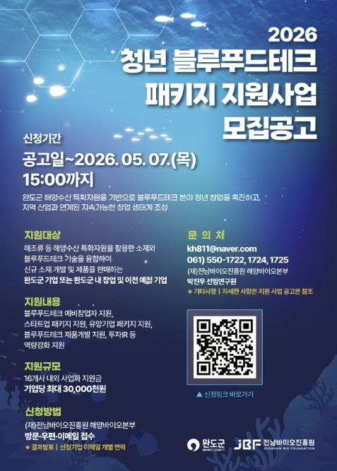 (포탈뉴스통신) 완도군은 지역의 해양 수산 자원을 고부가가치로 전환하고 청년 창업을 돕기 위해 ‘2026년도 청년 블루푸드테크 패키지 지원 사업’ 참가자를 모집한다.