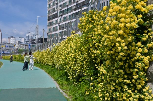 4월 중순부터 꽃망울을 터뜨리기 시작한 목향장미는 4월 말에서 5월 초 만개할 예정으로, 노란 장미들이 하천변 벽면을 뒤덮어 노란빛 플라워 커튼을 드리운 듯한 특별한 풍경을 선사한다.