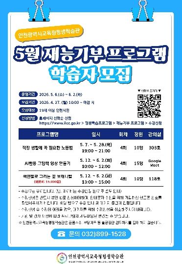 (포탈뉴스통신) 인천광역시교육청평생학습관은 오는 27일부터 시민의 재능을 나누는 ‘재능기부 프로그램’ 학습자를 모집한다.