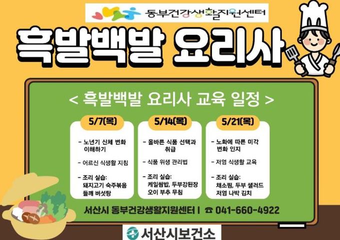 (포탈뉴스통신) 서산시 보건소 동부건강생활지원센터에서 60세 이상 남성어르신을 대상으로 건강한 식생활 실천과 자가 건강관리 능력 향상을 위해 '흑발백발 요리사' 프로그램 대상자를 모집한다고 밝혔다.