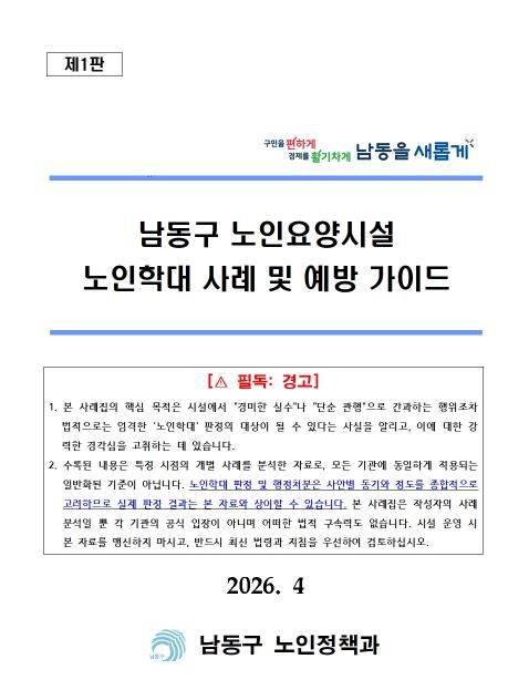 한편, 남동구는 이번 지침서를 관내 노인복지시설 및 장기요양기관에 배부하고, 시설장 및 종사자를 대상으로 한 실무 교육 자료로 적극 활용할 계획이다.