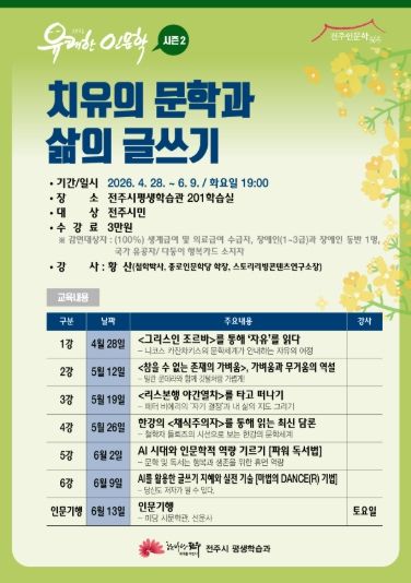 이번 유쾌한 인문학은 전주시민이면 누구나 참여할 수 있으며, 수강료는 3만 원(어린이 인문학=5000원)이다. 참여를 원하는 시민은 전주시평생학습관 누리집(e.jeonju.go.kr) 또는 전화(063-281-5367)로 신청하면 된다.