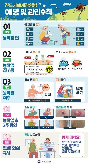 질병관리청 통계에 따르면 국내에서는 매년 쯔쯔가무시증 약 5천~6천명, 중증열성혈소판감소증후군(SFTS) 약 200명 내외 등 진드기 매개 감염병 환자가 지속적으로 발생하고 있다. 감염 시 발열·두통·근육통·소화기 증상 등이 나타날 수 있으며, 중증으로 진행될 가능성도 있어 예방이 무엇보다 중요하다.