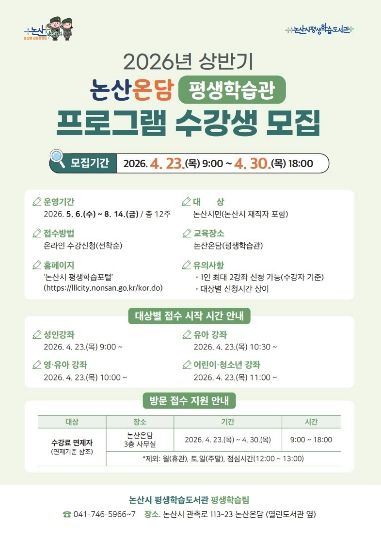 (포탈뉴스통신) 논산시가 4월 23일부터 4월 30일까지 ‘2026년 논산시평생학습도서관 상반기 정규 프로그램’수강생을 모집한다.