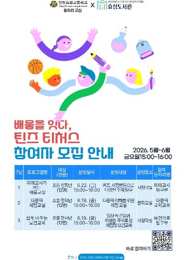 (포탈뉴스통신) 인천광역시 계양구립 효성도서관은 효성고등학교와 협력해 초등학생 대상 재능기부 체험형 교육 프로그램을 운영한다.