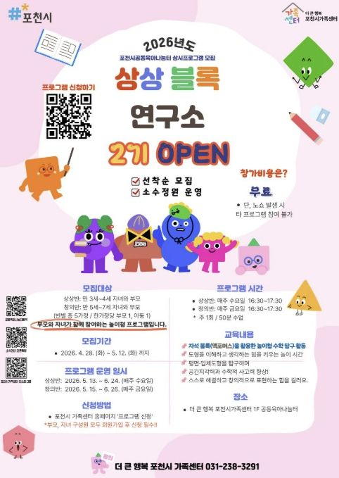 최선희 포천시가족센터장은 “상상블록연구소 1기에 보내주신 높은 관심과 참여에 감사드린다”며 “2기에서는 연령별 맞춤 운영을 통해 더 많은 가정이 함께할 수 있도록 준비한 만큼, 관심 있는 가정의 많은 참여를 바란다”고 전했다.