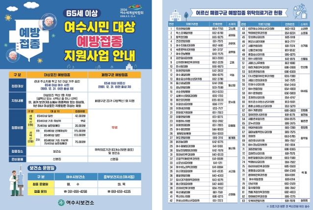 (포탈뉴스통신) 여수시는 65세 이상(1961. 12. 31. 이전 출생자) 여수 시민을 대상으로 폐렴구균 및 대상포진 예방접종 비용을 지원한다고 밝혔다.