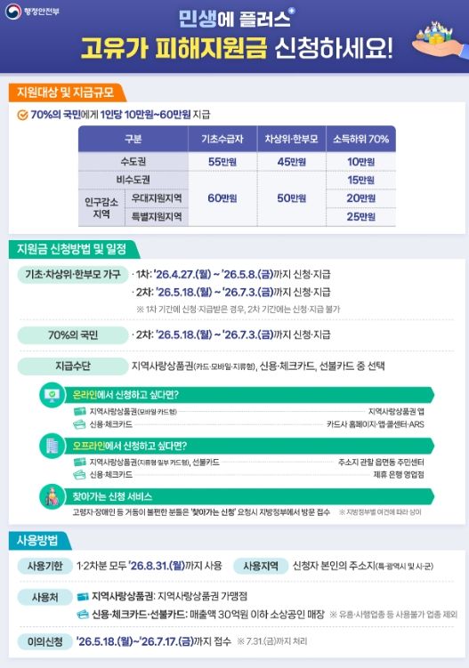 이어 2차 지급은 5월 18일부터 7월 3일까지 소득 하위 70% 군민을 대상으로 1인당 25만 원을 지급할 예정이며, 1차 기간에 신청하지 못한 대상자도 2차 기간에 추가로 신청할 수 있다.
