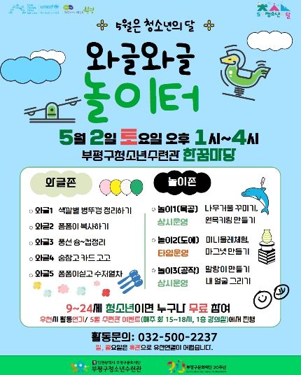 (포탈뉴스통신) 부평구청소년수련관은 오는 5월 2일 청소년 체험 행사 ‘와글와글 놀이터’를 운영한다고 밝혔다.