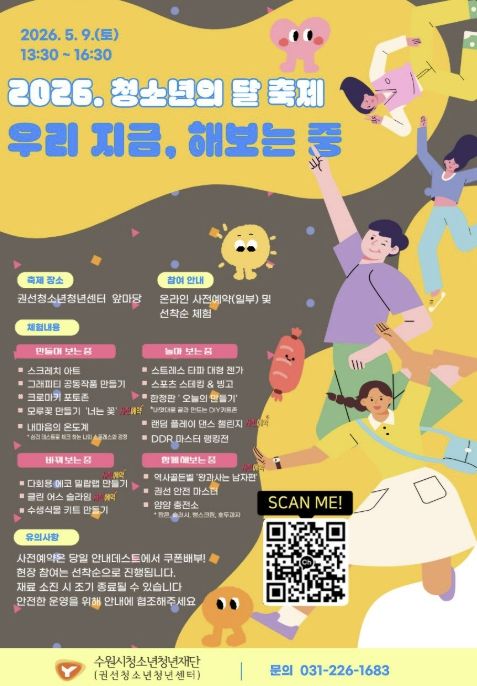 (포탈뉴스통신) 수원시청소년청년재단 권선청소년청년센터가 오는 5월 9일, 청소년이 주인공이 되어 직접 경험하고 도전하는 참여형 축제 ‘지금우리, 해보는중’을 개최한다고 밝혔다.