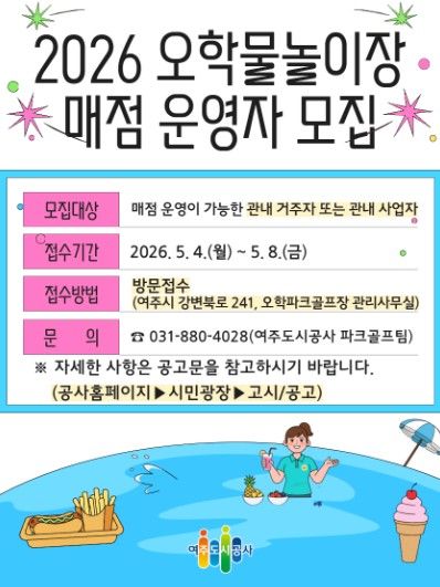 (포탈뉴스통신) 여주도시공사는 2026년 오학물놀이장 운영을 앞두고 이용객 편의 제공을 위한 매점 운영자를 공개 모집한다고 밝혔다.
