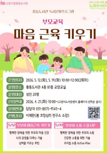 (포탈뉴스통신) 고양특례시 풍동도서관은 오는 5월 독서문화 프로그램 ‘부모교육, 마음 근육 키우기’를 진행한다고 22일 밝혔다.