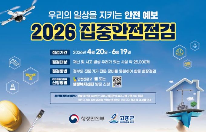 (포탈뉴스통신) 고흥군은 재난과 안전사고 예방을 위해 4월 20일부터 6월 19일까지 2개월간 ‘2026년 집중안전점검’을 실시한다고 밝혔다.