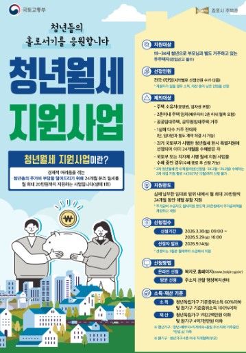 지원 대상은 소득·재산 요건을 충족하는 만 19세부터 34세 이하 무주택 청년으로, 부모와 별도로 거주하는 경우에 해당된다. 청년가구는 기준 중위소득 60% 이하 및 자산 1억 2,200만 원 이하, 원가구는 기준 중위소득 100% 이하 및 자산 4억 7,000만 원 이하 요건을 충족해야 한다.
