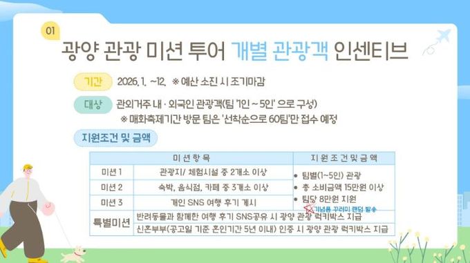 광양관광 인센티브는 기업 연수·회의 등 마이스(MICE)를 포함한 단체관광, 윤동주 테마관광, 개별 미션투어 등으로 구성돼 여행 형태에 따라 선택해 이용할 수 있다.