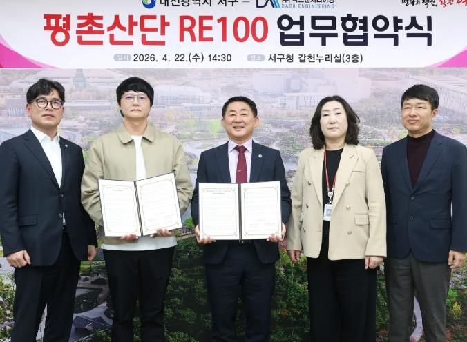 (포탈뉴스통신) 대전 서구는 22일 구청 갑천누리실에서 평촌일반산업단지 입주기업인 ㈜닥스엔지니어링과 재생에너지 보급 확산을 위한 ‘RE100 업무협약’을 체결했다.