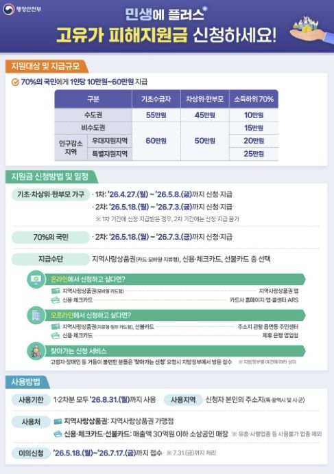 2차 신청·지급은 5월 18일부터 7월 3일까지 진행되며, 소득 기준에 따라 선정된 시민 70%에게 1인당 15만원이 지급된다.