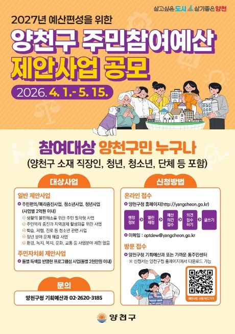 (포탈뉴스통신) 양천구는 2027년 예산 편성 과정에 구민의 목소리를 반영하기 위해 ‘주민참여예산 제안사업’ 공모를 오는 5월 15일까지 진행한다고 밝혔다.