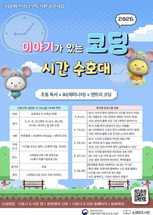 (포탈뉴스통신) 시흥시 소래빛도서관은 국립어린이청소년도서관이 주최하는 ‘2026년 이야기가 있는 코딩’ 공모사업 운영기관으로 선정돼 오는 5월 6일부터 어린이 대상 독서·디지털 융합 프로그램을 운영한다.