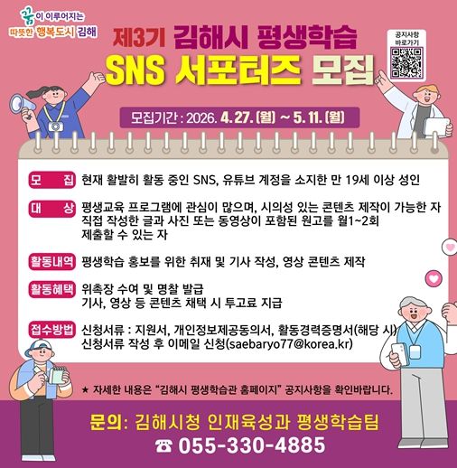 (포탈뉴스통신) 김해시는 27일부터 5월 11일까지 제3기 김해시 평생학습 SNS 서포터즈를 모집한다.