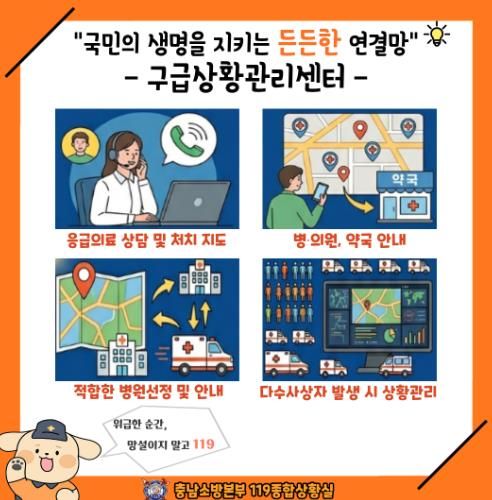 119구급상황관리센터는 주말과 공휴일을 포함 24시간 운영되며, 전국 어디서든 응급의료 상담 및 처치 지도, 병‧의원 약국 안내, 적합한 병원선정 및 안내, 다수사상자 발생 시 상황관리 등 다양한 응급상담 서비스를 지원하고 있다.