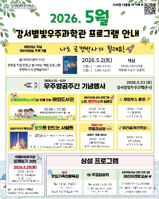 (포탈뉴스통신) 서울 강서구 강서별빛우주과학관은 5월 어린이날과 우주항공주간을 맞아 어린이부터 성인까지 온 가족이 함께 우주의 신비를 즐길 수 있는 특별 프로그램을 운영한다.