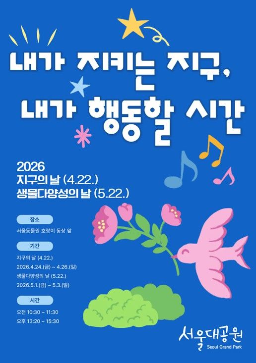 이번 행사는 봄철 나들이객이 집중되는 시기에 맞춰 4월과 5월 두 차례에 걸쳐 총 6일간 진행된다. ▲지구의 날 행사는 4월 24일부터 26일(일)까지, ▲생물다양성의 날 행사는 5월 1일부터 3일까지 각각 3일간, 서울동물원 정문 호랑이상 앞 광장에서 열린다.