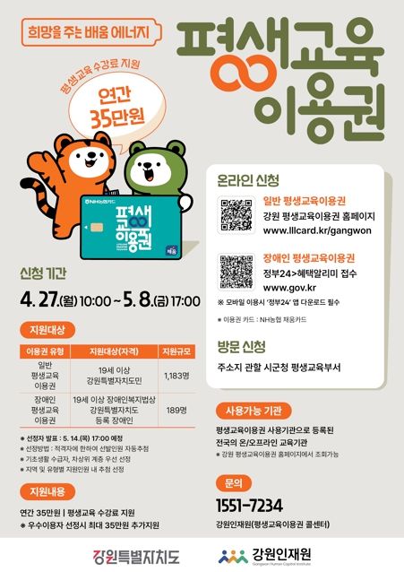 (포탈뉴스통신) 홍천군이 경제적 여건에 따른 교육 격차를 줄이고 평생교육 소외계층 성인의 자아실현을 돕기 위해 ‘2026년 강원특별자치도 평생교육이용권 2차 신청’을 4월 27일부터 5월 8일까지 받는다.