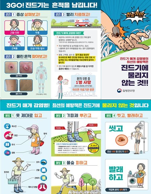 야외활동 시에는 ▲긴팔·긴바지·양말 착용 ▲기피제 사용 ▲돗자리 없이 풀밭에 앉지 않기 ▲풀밭 위에 옷 벗어두지 않기 ▲귀가 후 즉시 샤워 및 세탁 ▲반려동물 귀가 후 진드기 확인 등 예방 수칙을 반드시 지켜야 한다.