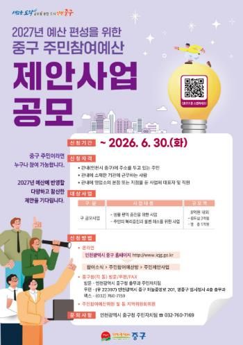 (포탈뉴스통신) 인천시 중구는 ‘2027년도 예산편성을 위한 주민참여예산 제안사업 공모’를 추진한다고 23일 밝혔다.