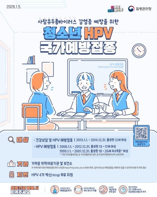 접종 대상자는 가까운 위탁의료기관 또는 보건소를 방문해 무료로 HPV 백신(HPV 4가)을 접종받을 수 있으며, 접종 가능 의료기관과 접종대상 해당 여부는 예방접종도우미 누리집을 통해 확인할 수 있다.