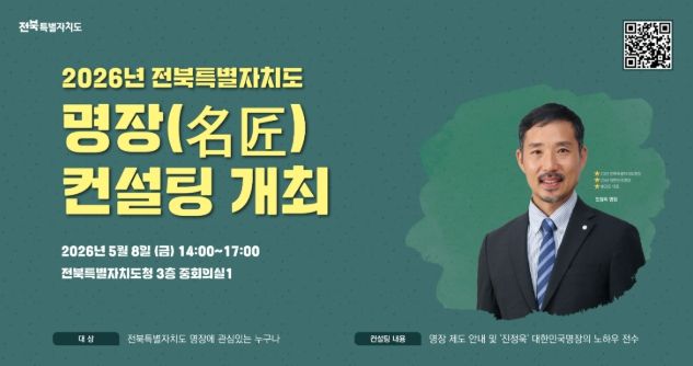 (포탈뉴스통신) 전북특별자치도는 5월 8일 전북도청 3층 중회의실에서 ‘2026년 전북특별자치도명장 컨설팅’을 개최한다고 23일 밝혔다.