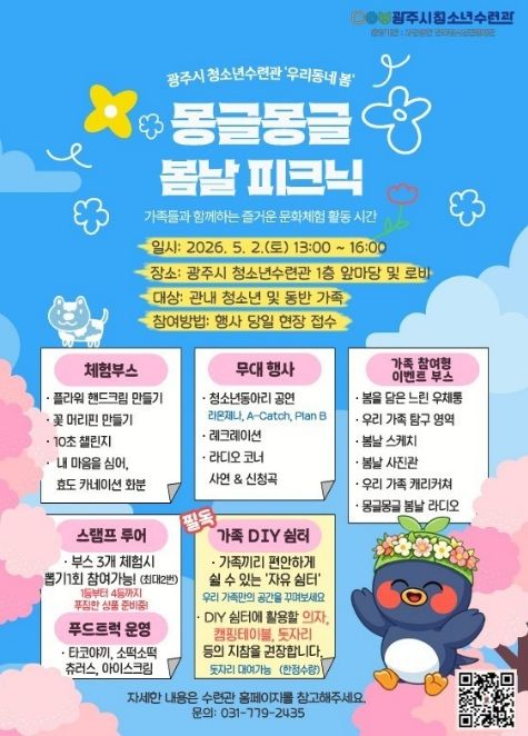 (포탈뉴스통신) 광주시 청소년수련관은 오는 5월 2일 오후 1시부터 수련관 1층 앞마당 및 로비에서 ‘2026년 우리동네 봄 몽글몽글 봄날 소풍’을 개최한다고 23일 밝혔다.