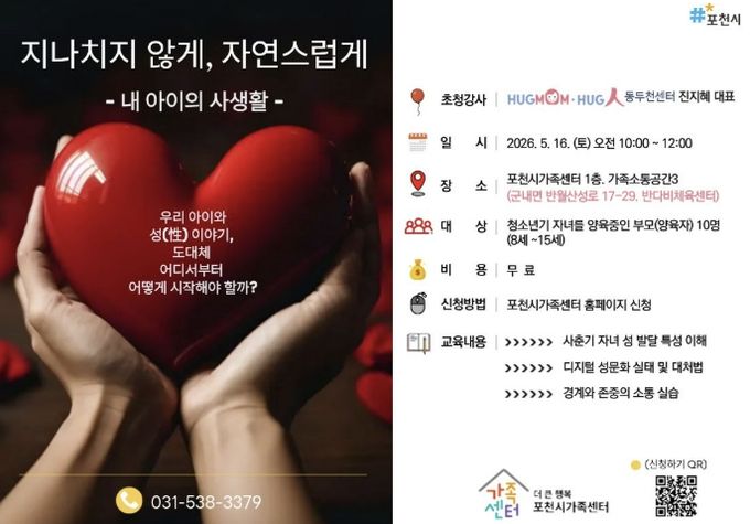 (포탈뉴스통신) 포천시 직영 더 큰 행복 포천시가족센터는 오는 21일부터 사춘기 자녀를 둔 양육자를 대상으로 부모 교육 프로그램 ‘지나치지 않게, 자연스럽게’의 참여자를 모집한다. 이번 교육은 5월 16일 오전, 포천시가족센터 가족소통공간(반다비체육센터 1층)에서 대면 강의로 진행된다.