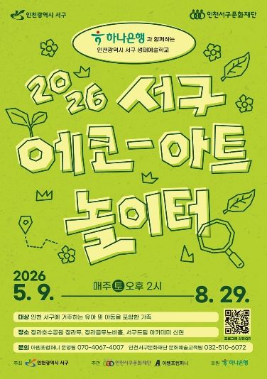 (포탈뉴스통신) (재)인천서구문화재단(대표이사 김성하)은 하나은행과 함께하는 2026년 ‘서구 에코-아트놀이터 시즌3’를 운영한다. 이는 도심 속 생태환경을 주제로 한 가족 참여형 문화예술교육 프로그램이다.