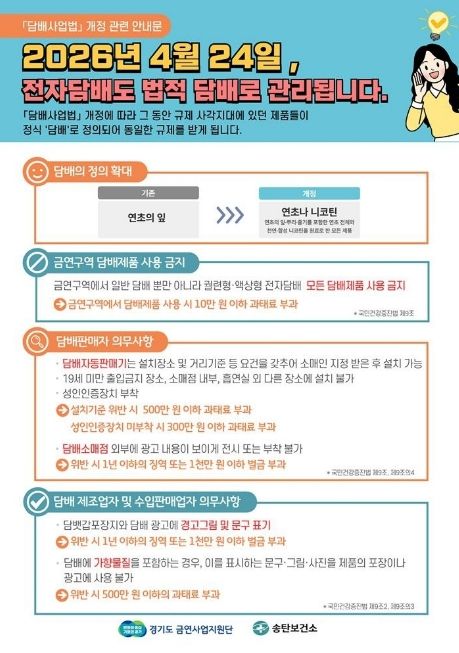 이번 법 개정으로 담배의 정의가 ‘연초 또는 니코틴’으로 확대되면서 액상형 전자담배와 합성니코틴 제품까지 모두 기존 담배와 동일한 규제를 적용받게 된다. 이에 따라 공원, 음식점 등 법정 금연구역에서는 전자담배를 포함한 모든 담배의 흡연이 금지되며, 위반 시 과태료 10만 원이 부과된다.