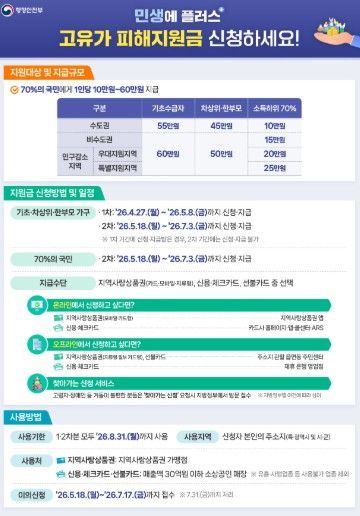 신청 기간은 4월 27일부터 5월 8일까지이며 신청 기간 첫 주는 요일제(출생년도 끝자리 기준)가 적용되고, 이후에는 요일에 관계없이 신청 가능하다. 5월 1일이 휴일인 관계로 목요일인 4월 30일엔 출생년도 끝자리 4,9,5,0이 대상이다. 또한, 오프라인 신청(행정복지센터 방문 신청)이 많을 경우 카드 물량 부족으로 지급이 지연될 우려가 있으니 가급적 온라인 신청을 권장한다.