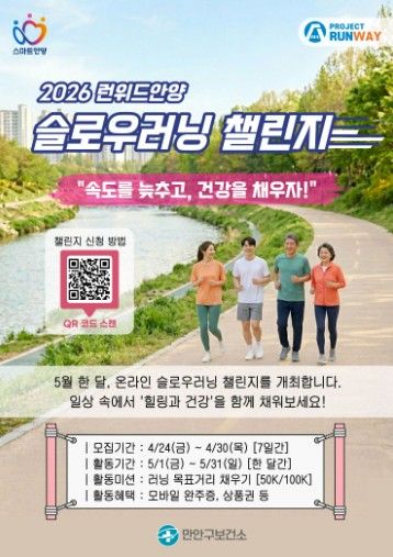 (포탈뉴스통신) 안양시는 시민들의 일상 속 신체활동을 독려하고 건강한 운동 습관 형성을 돕기 위해 오는 5월 한 달간 ‘2026 런위드안양 슬로우러닝 챌린지’를 개최한다고 23일 밝혔다. 참가자 모집은 이달 24일부터 30일까지 진행된다.