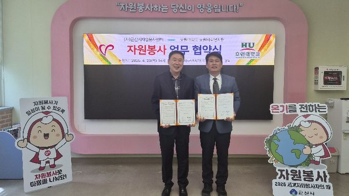 (포탈뉴스통신) (사)군산시자원봉사센터(이사장 황진)는 4월 23일 군산시자원봉사센터 세미나실에서 호원대학교 호원사회봉사단(단장 서충길)과 지역사회 연계 봉사활동 활성화를 위한 업무협약(MOU)을 체결했다.