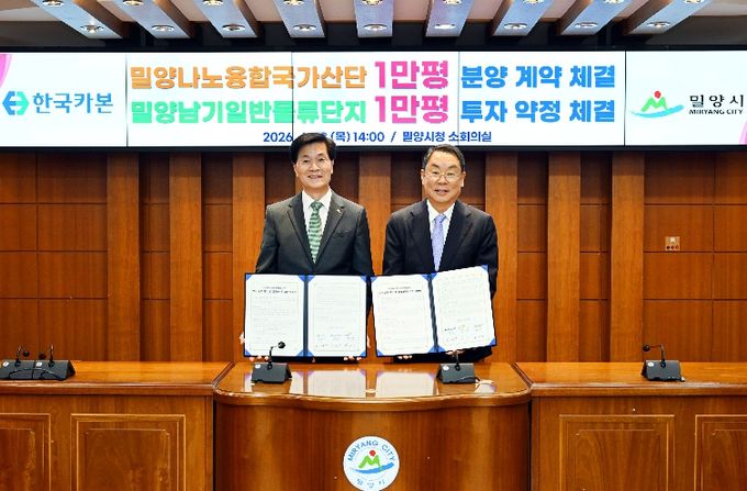 (포탈뉴스통신) 경남 밀양시는 23일 시청 소회의실에서 ㈜한국카본, 한국토지주택공사 경남지역본부와 함께 ‘밀양나노융합국가산업단지 부지분양 계약 및 밀양남기일반물류단지 투자약정’을 체결했다.