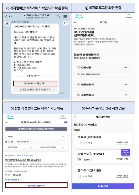 앞으로는 안내 문자 하단의 “복지서비스 확인하기” 버튼을 클릭하면 안내받은 복지서비스를 곧바로 온라인으로 신청*할 수 있어 안내부터 신청까지 한 번에 처리할 수 있게 됐다.