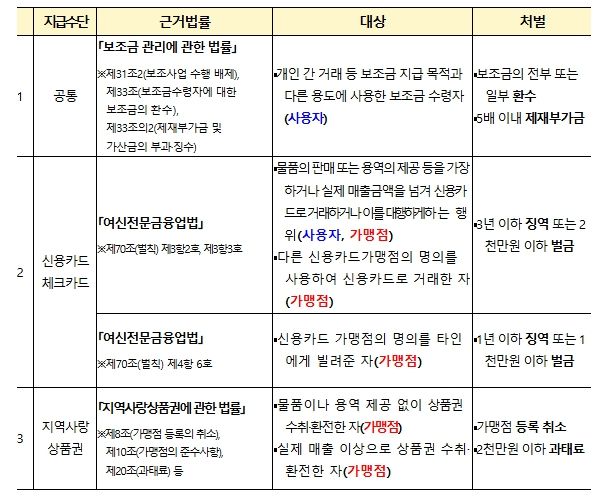 또한, 지역별 ‘부정유통 신고센터’를 운영하여 가맹점을 수시 단속하고 온라인 커뮤니티 등에서 개인 간 거래가 발생하지 않도록 모니터링을 강화해 줄 것을 각 지방정부에 요청했다.