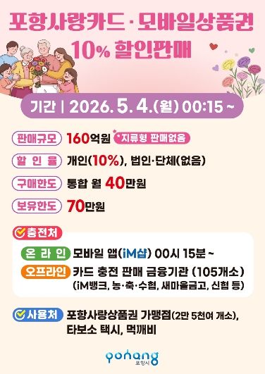 시는 올해 들어 이달까지 총 1,230억 원 규모의 포항사랑상품권을 발행한 데 이어, 이번 할인 판매분 160억 원을 유통해 지역 상권 내 소비를 촉진하고 경기 회복 흐름을 이어간다는 방침이다.