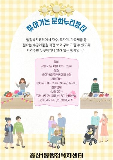 (포탈뉴스통신) 고양특례시 일산동구 중산1동은 오는 4월 27일 오전 10시부터 오후 3시까지 센터 5층 다목적실에서 ‘찾아가는 문화누리장터’를 개최한다.