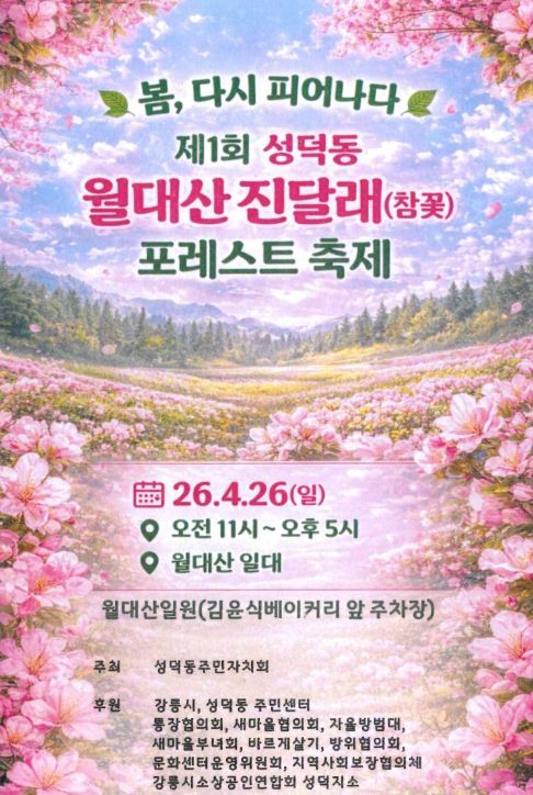 (포탈뉴스통신) 강릉시 성덕동 주민자치회(회장 박철근)는 오는 26일 11시부터 17시 까지 월대산 일원에서 2026년 제1회 성덕동 월대산 진달래 포레스트 축제를 개최한다.
