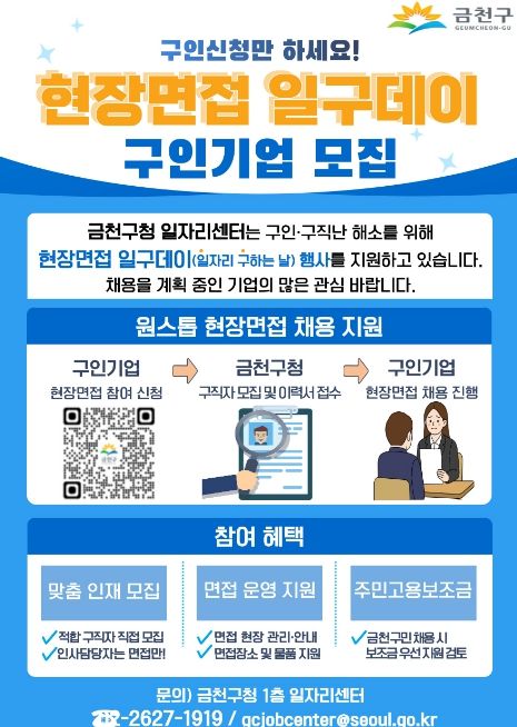 (포탈뉴스통신) 금천구는 구인·구직난을 해소하고, 기업의 원활한 채용을 지원하기 위해 ‘현장면접 일구데이’ 참여 기업을 상시 모집한다고 밝혔다.