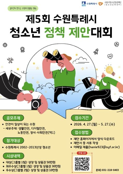 (포탈뉴스통신) 수원시청소년청년재단 수원청소년문화센터는 청소년이 정책을 기획하고 제안하는 ‘제5회 수원특례시 청소년 정책 제안대회’ 참가팀을 4월 27일부터 5월 27일까지 모집한다.