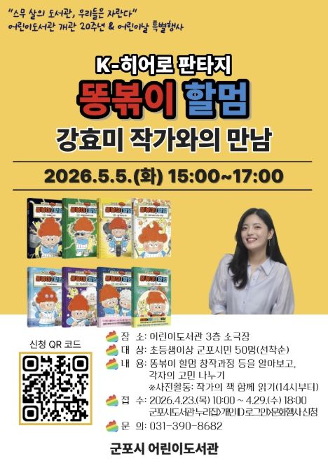 이번 행사는 “스무 살의 도서관, 우리들은 자란다”라는 주제로 2026년 5월 2일(토)부터 5월 20일(수)까지 진행되며, 군포시민 누구나 참여할 수 있다. 5월 3일(일)에는 고전동화를 줄인형으로 재해석한 가족 참여형 인형극 ‘빨간모자’가 상연되며, 5월 5일(화)에는 김선남 작가의 그림책 콘서트 ‘우리동네 나무가 건네는 노래’와 K-히어로 판타지 '똥볶이 할멈'강효미 작가와의 만남이 이어질 예정이다.