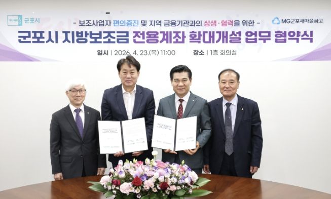 (포탈뉴스통신) 군포시는 지방보조금 전용계좌 개설 금융기관을 기존 시 금고인 NH농협은행에 더해 새마을금고까지 확대하기 위한 업무협약을 23일 체결했다고 밝혔다.