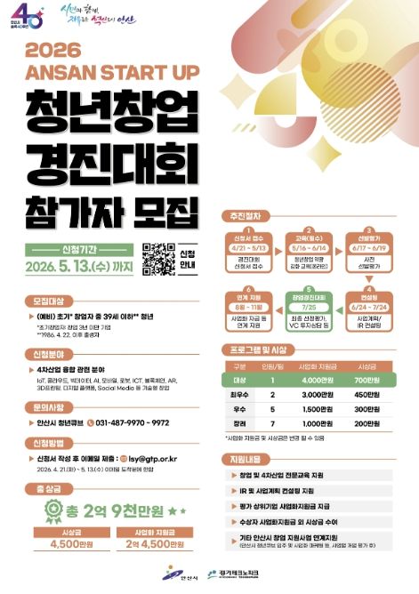 (포탈뉴스통신) 안산시는 창의적인 아이디어를 보유한 청년 창업가를 발굴하기 위해 내달 13일까지 ‘2026 안산 스타트업 청년창업 경진대회’ 참가자를 모집한다고 24일 밝혔다.